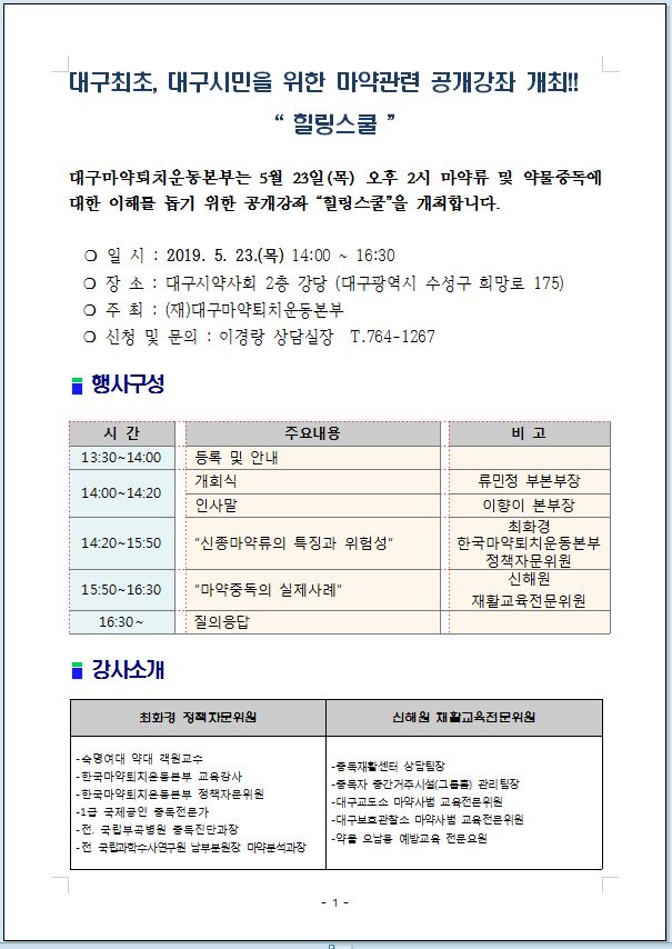 ´ë±¸¸¶¾àÅðÄ¡¿îµ¿º»ºÎ´Â 5¿ù 23ÀÏ(¸ñ) ¿ÀÈÄ2½Ã ´ë±¸½Ã¾à»çȸ°ü 2Ãþ °´ç¿¡¼ ´ë±¸ÃÖÃÊ, ´ë±¸½Ã¹ÎÀ» À§ÇÑ ¸¶¾à °ü·Ã °ø°³°Á 'Èú¸µ½ºÄð'À» °³ÃÖÇÕ´Ï´Ù. ¸¹Àº Âü¿© ºÎʵ右´Ï´Ù.