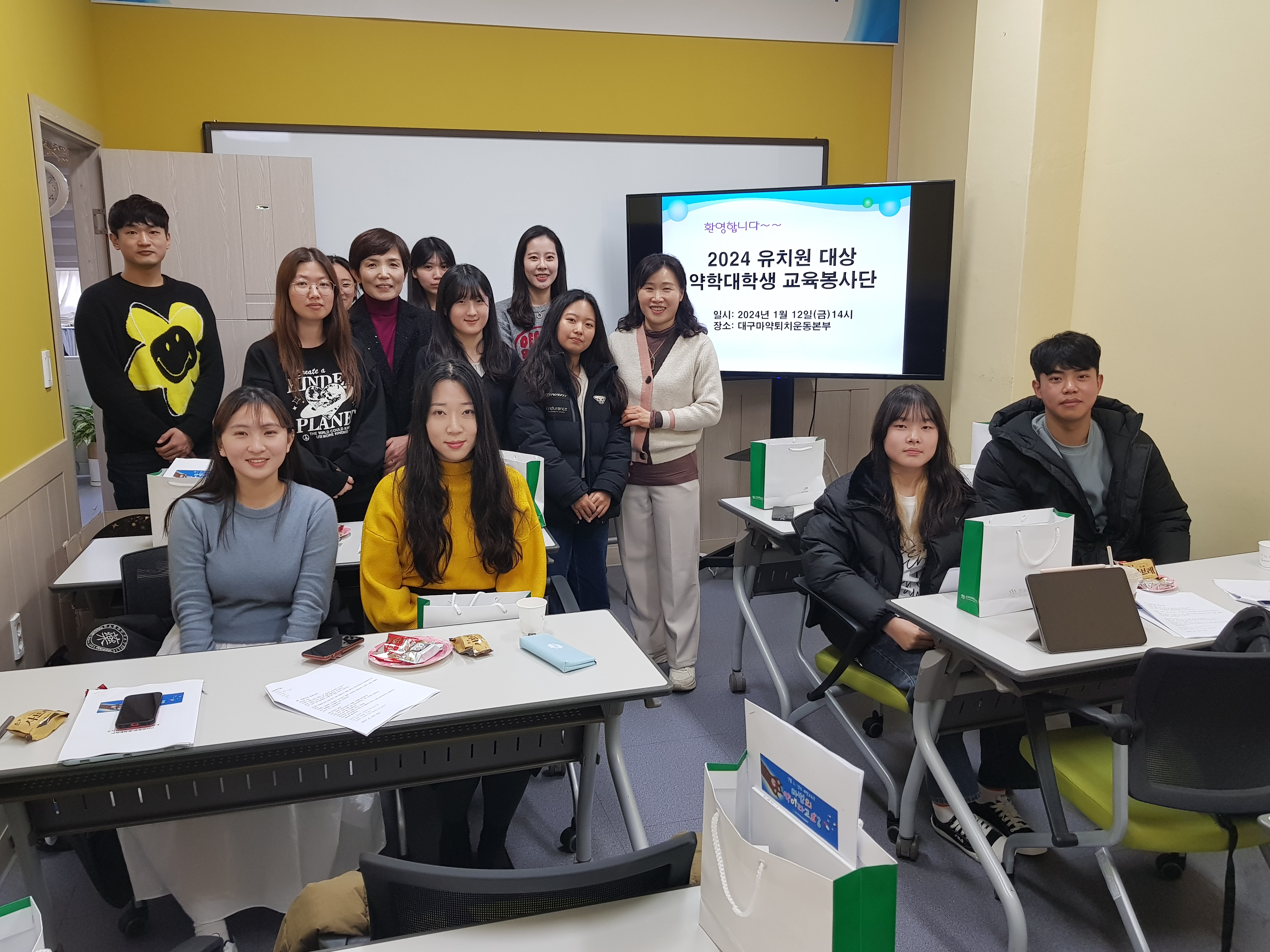 2024³â 1¿ù 12ÀÏ 14½Ã. ´ë±¸°æºÏ ¾àÇдëÇлýµéÀÌ ¸ð¿© 'À¯Ä¡¿ø ´ë»ó ¸¶¾à·ù ¿¹¹æ±³À°À» À§ÇÑ ¾àÇдëÇлý ±³À°°»ç´Ü' ¹ß´ë½ÄÀ» °¡Á³´Ù. °æºÏ´ë, °è¸í´ë, ´ë±¸°¡Å縯´ë, ¿µ³²´ë 4°³´ëÇÐ ¾àÇдëÇлýµé·Î ÀÌ·ç¾îÁø ±³À°°»ç´ÜÀº ¹æÇÐ µîÀ» ÀÌ¿ëÇÏ¿© À¯¾Æ, À¯Ä¡¿øÀ» ã¾Æ ¿¬·É´ë¿¡ ¸Â´Â ¿¹¹æ±³À°À¸·Î ±³À°ºÀ»çÇÒ ¿¹Á¤ÀÌ´Ù.
